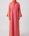 - DESIGN: A flowing jalabiya in vibrant pink and orange hues, featuring a striking geometric panel and floral details. Designed with wide sleeves and a relaxed silhouette for effortless elegance and comfort.